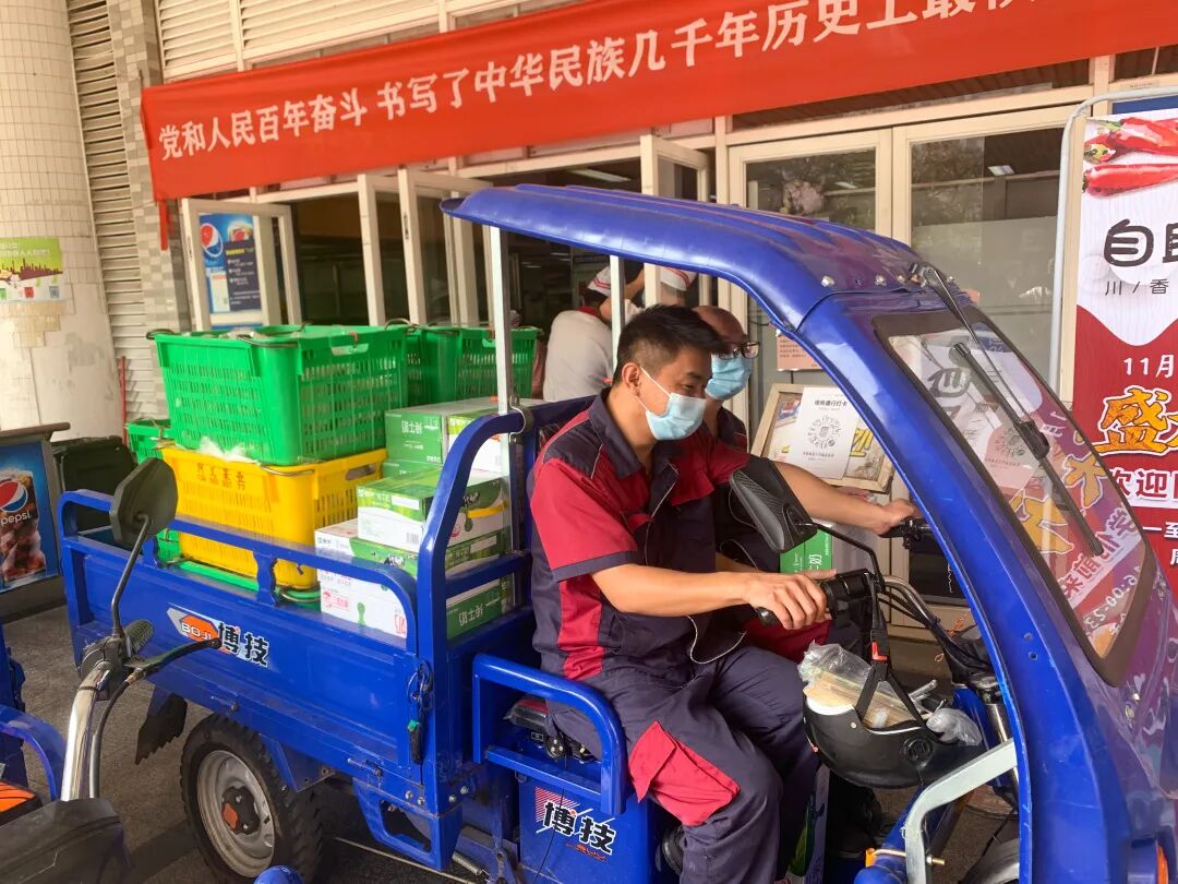 在学校志愿者、疫情防控突击队到位之前,后勤全体人员动用一切可以利用的力量,三轮车、私家车……推的、载的、搬的、抬的,想尽一切办法为各个楼栋里的师生送餐。