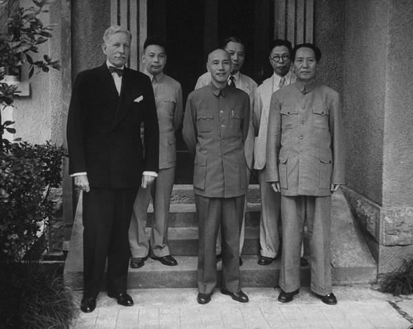 1945年8月28日,毛泽东应蒋介石之邀,在美国驻华大使赫尔利和国民党代表张治中的陪同下,偕周恩来、王若飞等,赴重庆会谈。图为毛泽东一行在重庆下飞机时合影。