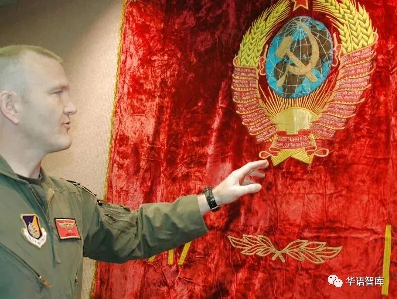 资料图片:第65中队飞行员讲解营房中悬挂的苏联国旗。(美国空军网站)