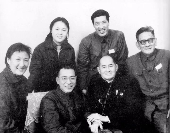 1970年代末,徐迟与数学家陈景润在一起。同行作家黄宗英、周明、秦牧