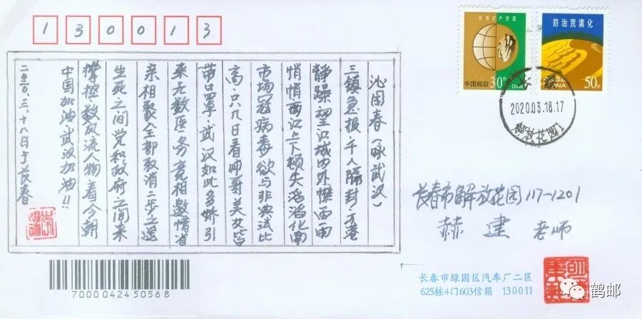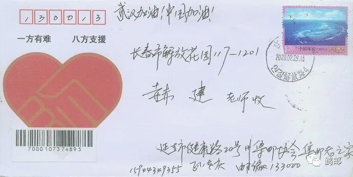 近期,收到孙吉庆&李林&李明德寄来抗疫纪念实寄封,再次谢谢!三封分别寄自“吉林延吉2020.02.29.13解放路4”(双文字)、“北京2020.02.29.20西外大街18”和“长春2020.03.18.17解放花园1”。三封均属民间个人自制纪念实寄封,带有自创元素,包括文字、邮票、邮局、日期等等选择,挺好的。![]()