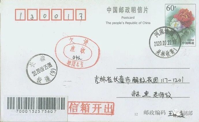 寄自我国最中邮局的戳片