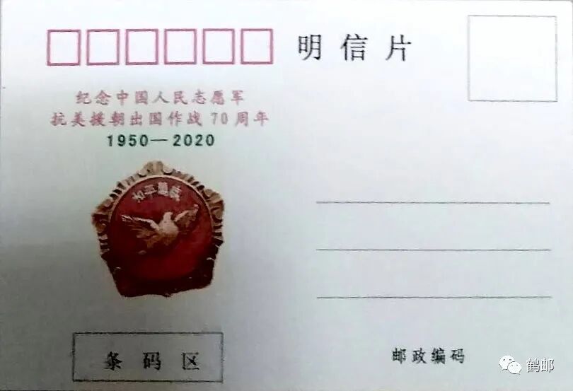 10月25日,我收到辽阳市李宝库老师寄来的《襄平邮谭》合订本6册,拆封后夹有一枚“抗美援朝出国作战70周年”纪念明信片。今年9月15日,刚好是抗美援朝出国作战的纪念日。1950年9月15日,美帝国主义将战烧到朝鲜半岛,威胁我国,为捍卫新中国政权,保卫世界和平。我国人民志愿军出国作战,同仇敌忾,各界人士纷纷响应,有钱出钱,有力出力抗击美帝国主义。明信片是枚无邮资明信片,尺寸为148x100mm, 和普通明信片无异,有条码区,邮政编码框。印有“纪念中国人民志愿军 抗美援朝出国作战70周年 1950—2020”的字样,下面是一枚“和平万岁”徽章。背面是“抗美援朝”出国作战的行军画面,还有“抗美援朝光荣榜”的纪念碑,展现了中国人民“抗美援朝”的胜利会永载史册,中国人民是战无不胜的,明信片均为彩色。![]()