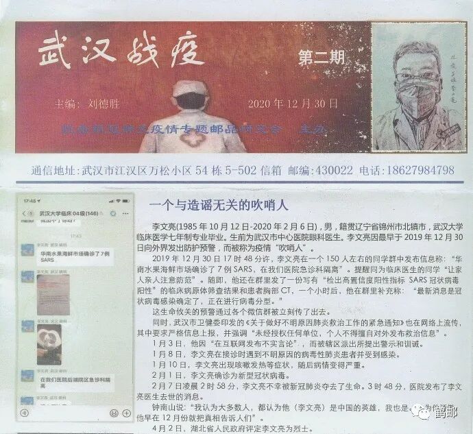 近日,收到刘德胜(圣者)寄来“环球人物”《武汉战疫》报实寄邮简,再次谢谢!该邮简寄自“湖北武汉2020.12.30.17彭刘杨1”,邮资机付费,粘贴平信条码白条邮寄,旁盖“武汉2020.12.30.18东亭1”邮政日戳,可以表明收寄是东亭邮政支局。![]()
