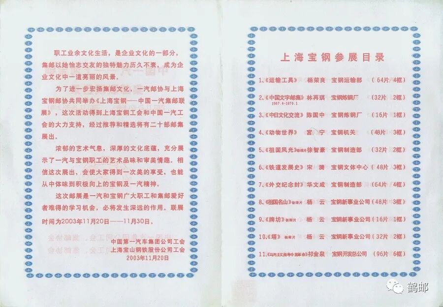 近期,借到李朝绂先生收藏的一汽邮展目录,扫描展示如下。该目录是2003年11月由中国一汽集团公司工会、集邮协会和上海宝钢股份公司工会、集邮协会联合举办集邮展览的展品目录。其中,先在长春展览(2003.11.20-22),之后在上海展览(2003.11.28-30)。展品22部,双方各11部。此次展品标注了框数,上海方面31框,长春方面48框,总计79框。该目录印有前言。该目录A4对折,普通白纸,红蓝双色印刷。![]()