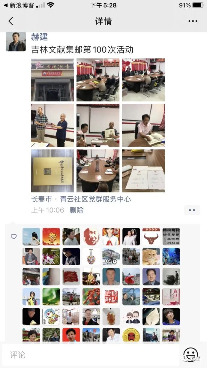 张宇会长主持活动,首先介绍和通报会务活动安排等。然后是举行《郭经华解放区邮票文存》(《吉林文献集邮》增刊第16期)读者见面会,张宇和郭经华分别介绍。最后是大家合影留念。2013年3月16日是第1次活动,2021年6月29日是第100次活动。赫建、吴志欣、王丽君等发表感想,大家对未来充满信心,不忘初心。该次活动,发放了《“党旗猎猎红”庆祝中国共产党建党一百周年主题集邮展》展品目录、吉林文献集邮明信片等。微信九宫格图片墙信息,得到朋友圈友点赞关注。![]()
