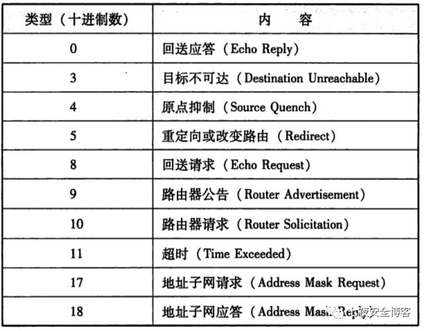 如上图所示,ICMP协议在实际传输中数据包:20字节IP首部 + 8字节ICMP首部+ 1472字节<数据大小>38字节。对于ICMP首部细分为8位类型+8位代码+16位校验和+16位标识符+16位序列号,其中类型的取值如下,我们比较关注的是请求(取值为8)和应答(取值为0)。