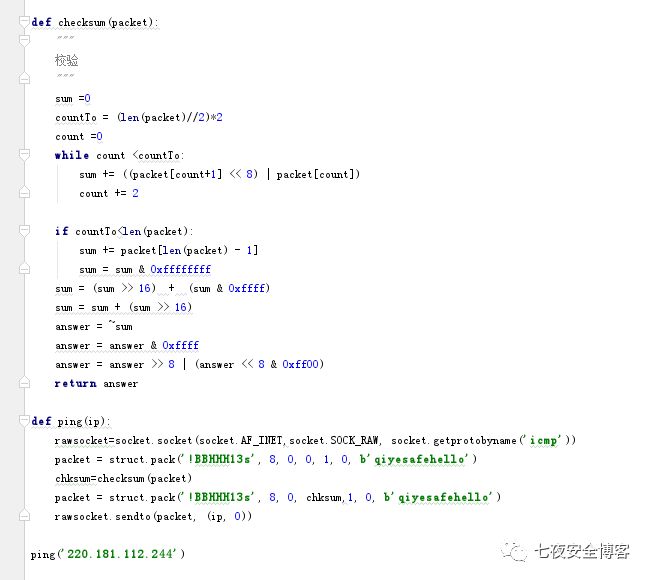在上面我们简单讲解了ICMP的报文格式,接下来我们使用Python3根据报文格式简单实现一下ping功能,主要用到了raw socket技术,即原始套接字,使用struct pack方法打包ICMP报文。代码实现如下所示: