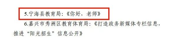 近日,浙江省教育厅新闻办公室、浙江教育报刊总社公布了2021年度浙江省优秀教育新媒体评选结果,宁海县教育局位列2021年度浙江省教育新媒体综合力十强榜首,同时宁海县教育局刊发的系列发布《你好,老师》获得浙江省新闻宣传主题策划奖。