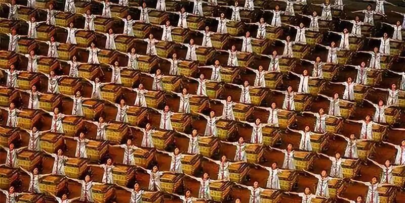 北京奥运开幕式,整体的美感,让你完全无视一个个个体的存在,每一个人都不过是一个活字零件。