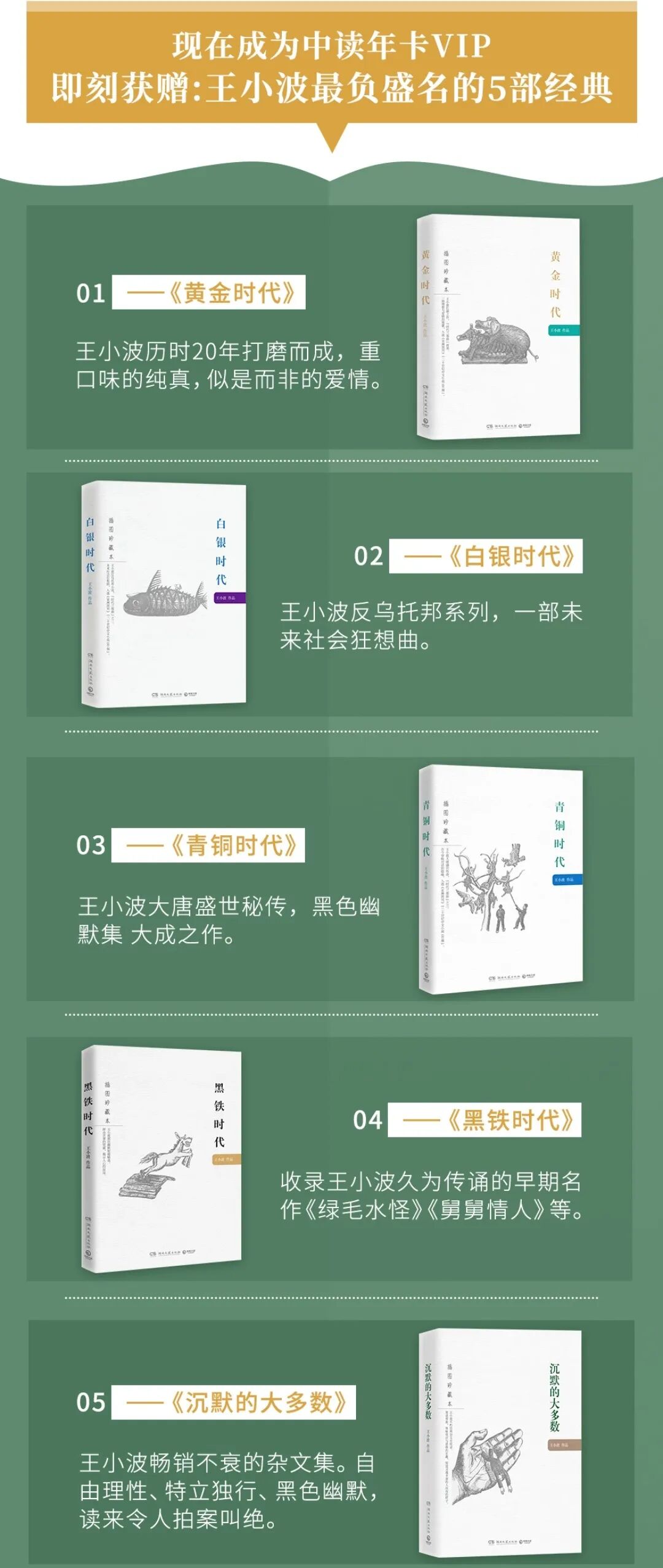 为方便更多读者亲近王小波迷人的文字世界,我们决定为开通年卡VIP的朋友(老会员在本页面续费,也可获赠),免费送出王小波作品集插图珍藏本(全5册)!将王小波最负盛名的5部作品《黄金时代》《白银时代》《青铜时代》《黑铁时代》《沉默的大多数》打包,一次全部送给你!