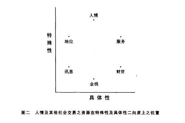 Foa和Foa在其“社会交易的资源说”(resource theory of social exchange)中,以“具体性”和“特殊性”两个向度来描述人们经常用来作社会交易之资源的性质(Foa and Foa,1976)。假如我们采用他们的坐标架构来描述“人情”的性质,则“人情”在其架构中的位置,应当与Foa和Foa所称的“爱情”约略相当(见图二)。由图二可以看出:在各种资源中,人情的特殊性最高。换言之,个人只和其关系网内的某些特定对象进行特殊的“人情交易”。人情的具体性则居中。换言之,作为社会交易资源的人情,不仅可能包含具体的金钱、财货或服务,而且还包含有抽象的情感。人情之不易计算,人情债之难以清偿,其道理即在于此。