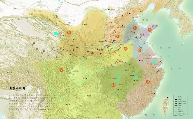 对这两种机制的研究已经很多,这里要特别提示的是它们的地理表征。李零在书中反复涉及的一些概念以及开列的一些标题,正可看作西周大一统的地理表征,诸如禹迹、九州、“中国是天下之中”、“中国是四国之中”、“中国是中心城市”(这是中国概念的原始起点)等。除此之外,还有一些李零自己的观察,如“中国是文明旋涡”、“中国的两半”、“中国的两个半月形文化传播带”、“冀州代表中国”、“中国的六大块或把大块”“西周有个大十字”、“北方纵深三条线”等。