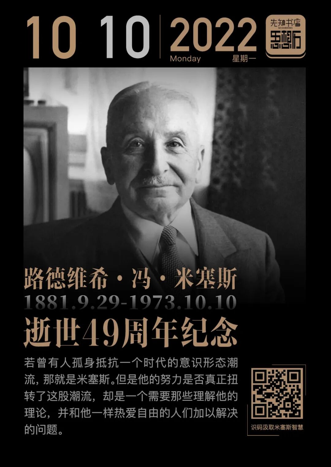 他的作品,本本经典。他的《人的行为》甚至被誉为文明人必读的经济学《圣经》。然而,想要全面阅读米塞斯,却并不容易——《人的行为》经常断货,《米塞斯回忆录》更是已绝版多年,而如今再版,极为难得。先知书店精选米塞斯作品最佳译本和版本,组成“读懂米塞斯”四书。读米塞斯的人生和作品,从中汲取力量。长按下图,识别图中的二维码,即可购买收藏(还可在页面一并选购“读懂哈耶克九书”)。