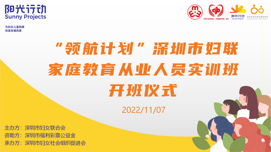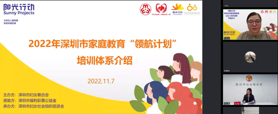 2022年11月7日,由深圳市妇女联合会主办、深圳市福利彩票公益金资助、深圳市妇女社会组织促进会承办的“领航计划”家庭教育从业人员实训班(第一期)正式启动。120名来自深圳市法院、市检察院、市教育局、市民政局的资深社工、老师、妇干、心理咨询师等参与了此次线上开班仪式。深圳市妇女联合会党组成员、副主席彭迎九出席了开班仪式并通过线上致辞。