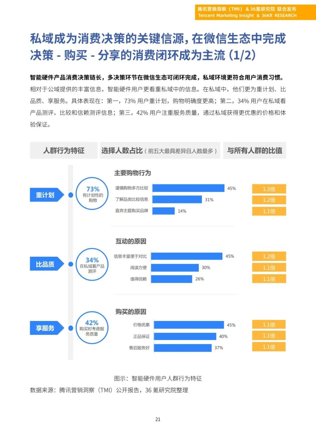 需要意识到,私域已经成为消费决策的关键信源。智能硬件产品消费决策链普遍较长,而相对于公域提供的丰富信息来说,私域环境更符合用户重计划、比品质、享服务的消费习惯。其中,微信生态成为用户购买智能硬件的主要私域阵地,借助社交平台与生俱来的优势,微信生态内多触点功能日益完善,用户微信生态中决策不再是单一孤岛,而是“决策-购买-分享”可一站完成的消费闭环,并以此成为主流。因此,基于微信生态的全域经营,能够系统化构筑“外引力”,从而赋能智能硬件品牌价值增益,是企业获取长期竞争优势和稳定超额利润,从而赢得资本青睐的重要途径。