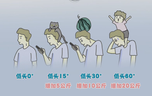 低头15度时,颈椎承受的重量增加5公斤;低头30度时,颈椎受力增加10公斤;而如果低头60度,颈椎的受力则要增加20公斤,相当于一个小朋友的体重。