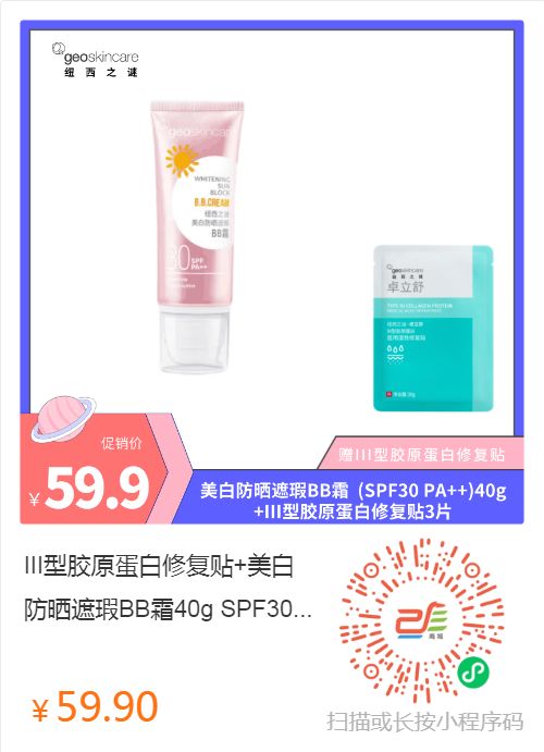 现在特惠价防晒霜一只,加上胶原蛋白修复贴3片,只要59.9,还是两折价格回馈大家。