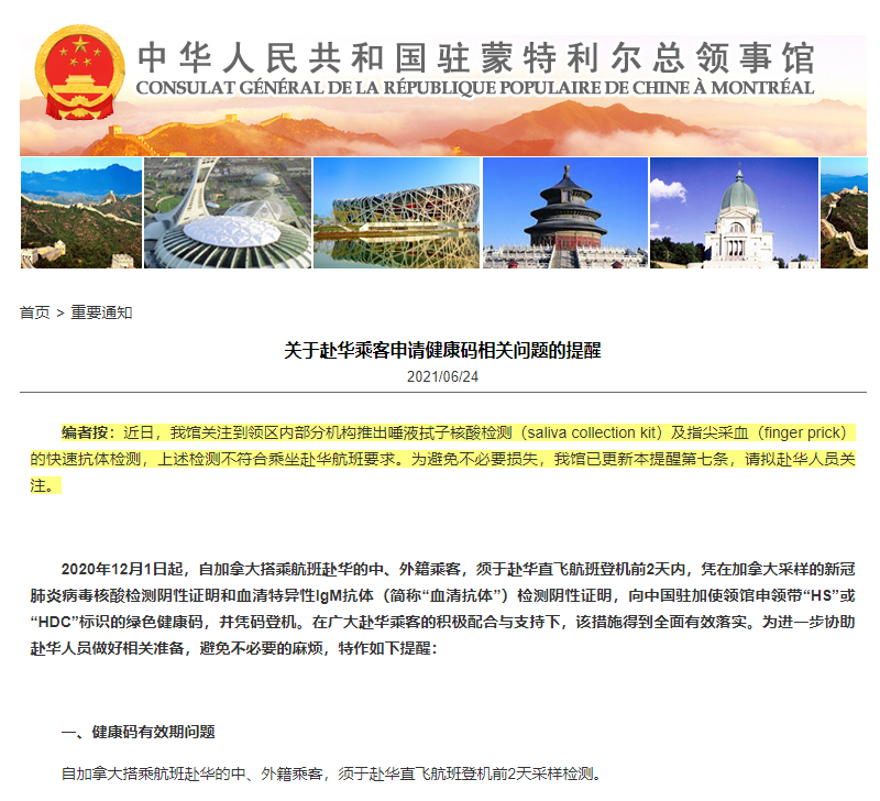 原文摘要:近日,我馆关注到领区内部分机构推出唾液拭子核酸检测(saliva collection kit)及指尖采血(finger prick)的快速抗体检测,上述检测不符合乘坐赴华航班要求。