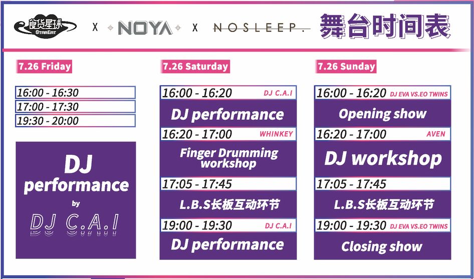 NOYA旗下音乐厂牌NOSLEEP不仅将带来燃爆夏日周末的音乐现场,更将举办一系列音乐Workshop,带大家零距离体验时代最前沿的音乐形式,释放即兴创作的乐趣!