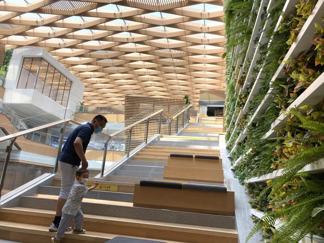 连桥中庭的线性活动空间延展至尽头是一个具有全景城市视野的室内大台阶,木质台阶显得更为自然平和,成为休息打卡的好去处。