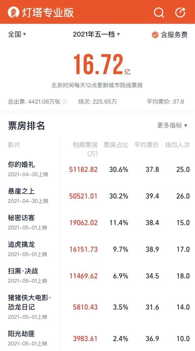 “史上最挤”的2021年五一档,最终总票房成绩定格在16.72亿元(含服务费),创下历史新高。据灯塔专业版数据,今年五一档总出票4421.08万张,上映场次达225.65万,均打破影史最高纪录。具体来看,此前最受机构看好的《你的婚礼》假期5日共收获5.12亿元票房,成为档期内票房冠军。张艺谋导演的谍战片《悬崖之上》后期发力,最终5日票房为5.05亿元,以不到1000万元的差距位列第二。另有三部影片票房过亿,分别为《秘密访客》1.9亿元、《追虎擒龙》1.61亿元、《扫黑•决战》1.14亿元。此外,《猪猪侠大电影•恐龙日记》《阳光劫匪》《名侦探柯南:绯色的子弹》《哥斯拉大战金刚》《真•三国无双》位列票房榜五至十位。