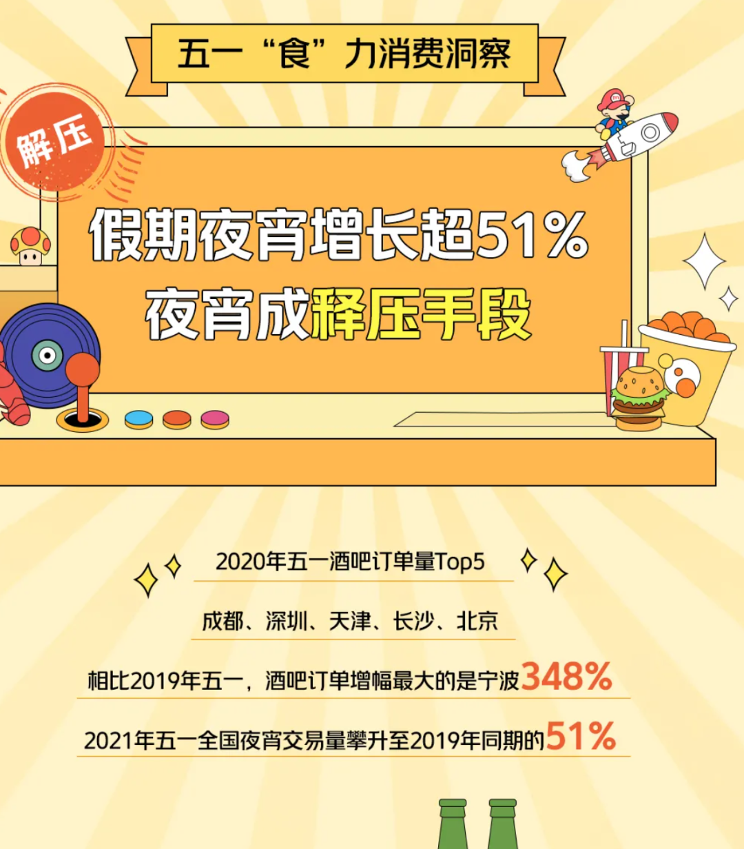 美团美食数据显示,五一全国夜宵交易量增长超去年同期的51%。值得关注的是,成都、深圳、天津、长沙、北京这几个城市,酒吧订单量成为TOP5。其中,订单增幅最大的是宁波,比去年同期增长超348%!