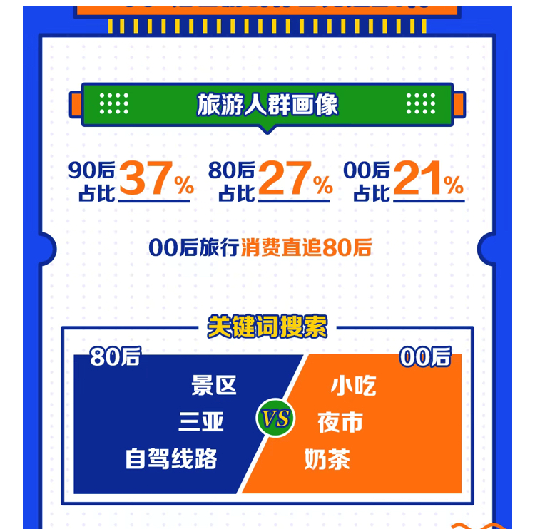 五一期间,携程推出一组调查数据 :在旅游人群画像中,00后占比已经达到了21%,成为了最具消费潜力的群体。00后的旅游关注点,已经发生了翻天覆地的变化。对比80后“景区”“三亚”“自驾线路”这三大关键词,00后的关键词搜索是“小吃”“夜市”“奶茶”。