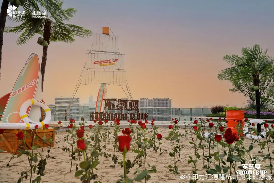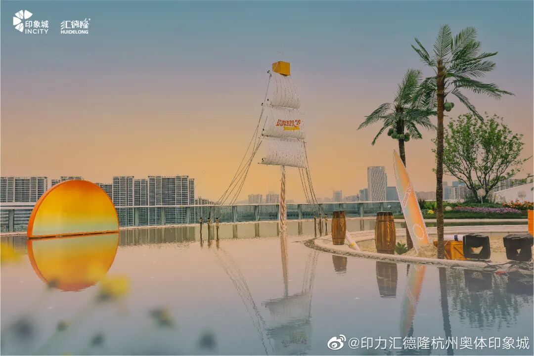如何在城市演绎远方的浪漫,在购物中心开放空间营造沙滩、海浪、泳池等亲海派对场景,无疑是在炎炎夏日激发年轻人打卡行动力最直接的方式。倘若能将场景和空间更“无缝”地融合,打造更多人能够参与的大型互动空间,想必能收到意想不到的效果。作为五周年夏日特辑,今年夏天,深圳万象天地在街区水广场打造了浪人海滨小镇,将Summer Party「城市浪人计划」与High Lounge搬到了商厦的楼宇之中,成为浪人们的中转站。值得一提的是,借此契机万象天地水广场全新双层概念空间——High Lounge也正式亮相,一同亮相的还有围绕“城市浪人计划”进行主题定制的品牌门店,如delicates、BARREL、NANONARKET、SUNNYLIFE、Cream Story、山池、野萃山、Allcoconut蔻蔻椰、POTATO CORNER等。据悉,未来该空间将在每个季度带来不同主题的品牌定制店。今年夏天,杭州奥体印象城在屋顶特色空间“杭州首个天空之境水景/首个天空跑道”打造以“日落沙滩/日落微醺市集”为主的泰式度假风情体验。借助阳光沙滩、玫瑰椰树、风帆和水景,呈现了极具夏日风情的日落沙滩,将购物中心变身为夏日城市微度假目的地。