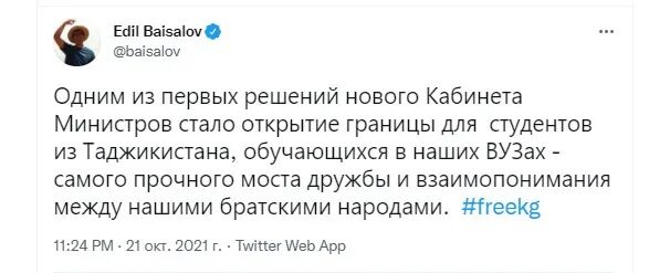 日前,吉政府副总理埃迪里·巴依萨洛夫在社交媒体上宣布,吉国政府决定为在吉国大学学习的塔吉克斯坦学生开放边界。