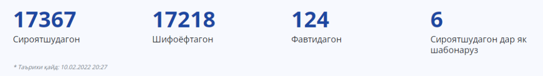 10日,塔吉克斯坦卫生部报告,新增确诊6例,目前塔吉克斯坦累计确诊17367例,治愈17218例,死亡124人。