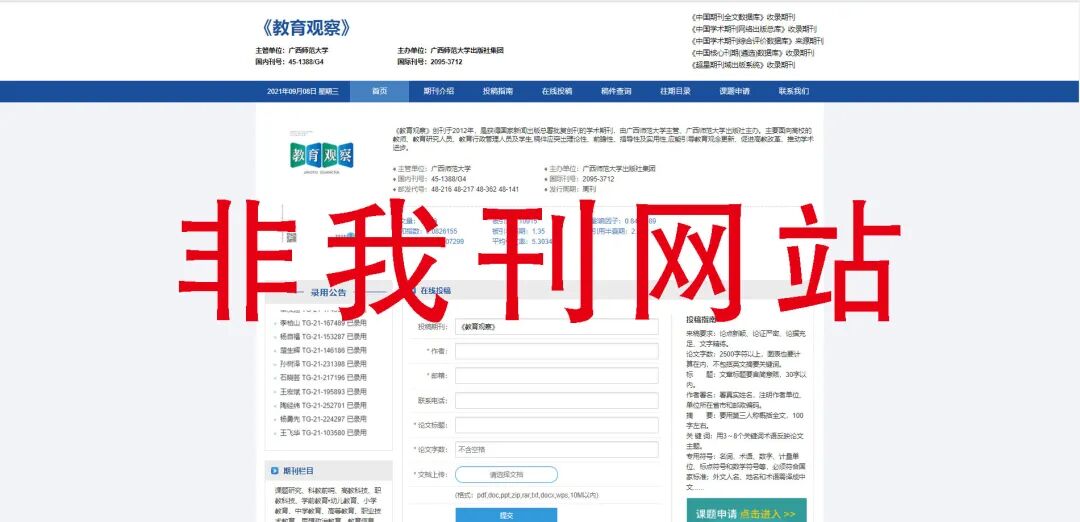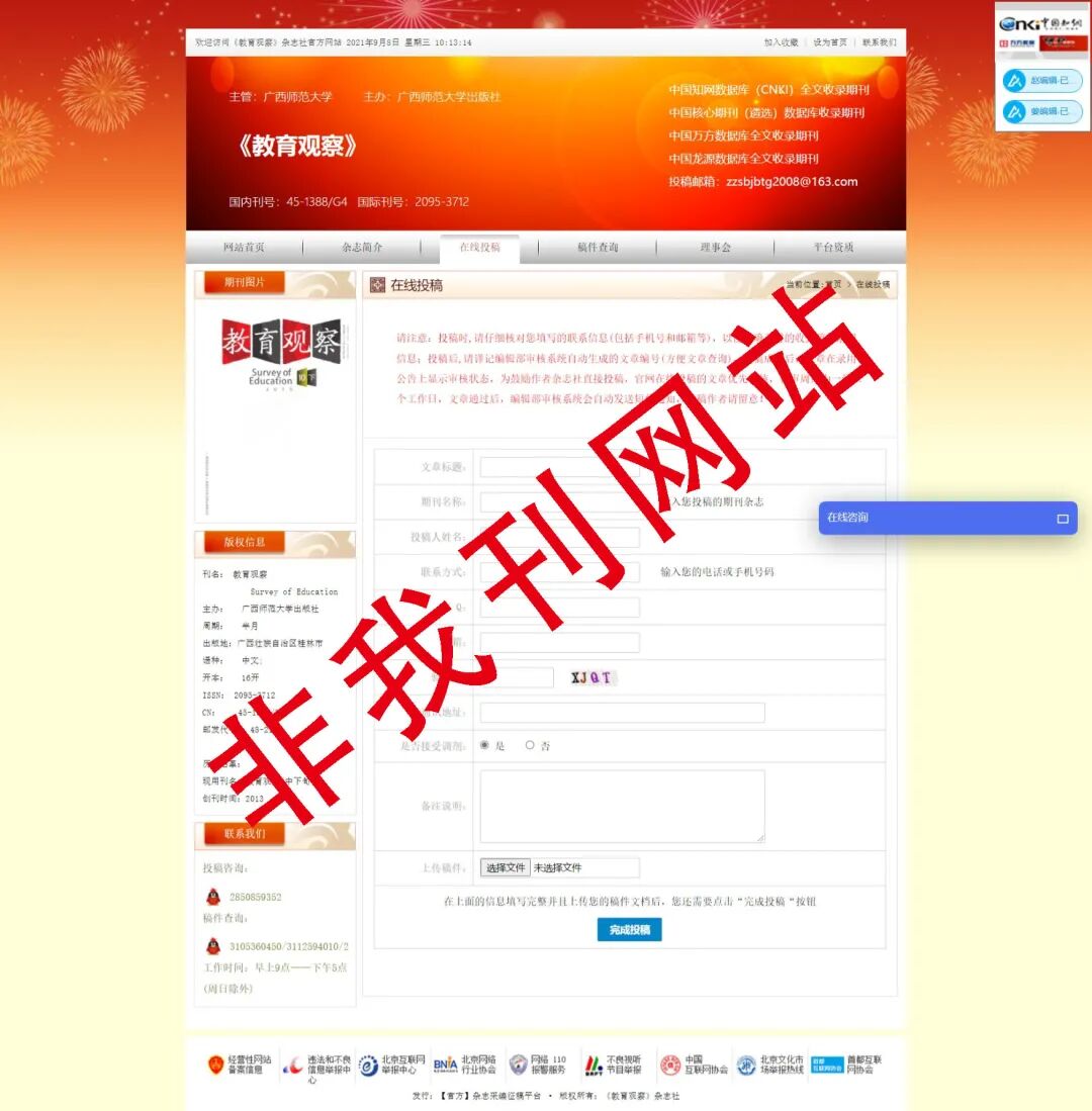 再次提醒作者、读者,投稿前一定注意甄别,切勿上当受骗。同时,欢迎作者、读者继续支持《教育观察》杂志,从正规渠道投稿(投稿信箱:gljygc@163.com和gljygc@gxqkcm.com)。