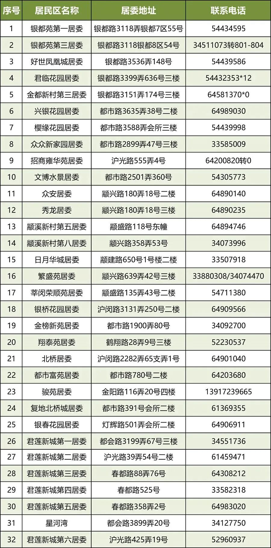 各居民区热线电话