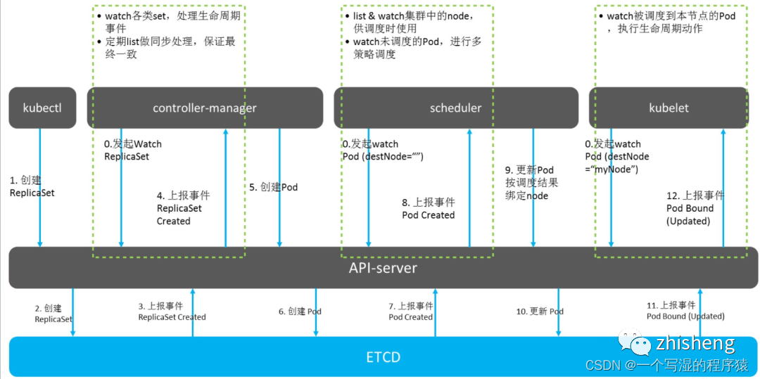 Apiserver收到指令后,通知给controller-manager创建一个资源对象;