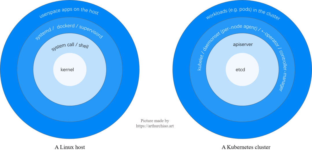 从架构层次和组件依赖角度,可以将一个 K8s 集群和一台 Linux 主机做如下类比: