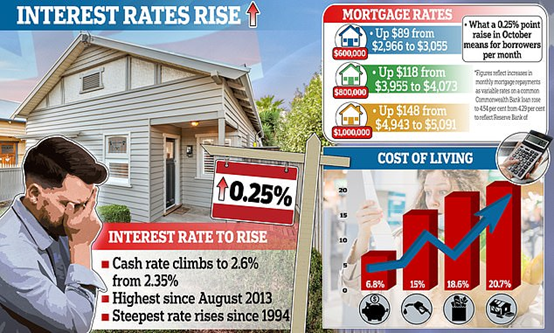 一旦此次加息流向房主,最新的0.25个百分点的增长将使平均抵押贷款为 600,000 澳元的借款人每月的抵押贷款还款额将增加 89 美元,达到 3,055 澳元。