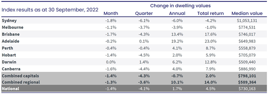 CoreLogic 今天(10月3)日公布了其9月份住房价格指数(HVI)。报告显示,9月澳洲州府城市的住宅价格进一步下降了1.4%,年度下滑了0.7%,住宅中位数价格降至79.8万澳元。唯一没有出现月度下跌的首府城市是达尔文,悉尼的房价下跌了1.8%,布里斯班和堪培拉的跌幅差不多。不过,9月份房价跌幅没有8月份那么大,当时房价在一个月内下跌了1.6%。过去三个月,悉尼的房地产市场已累计下跌6.1%,霍巴特和堪培拉的跌幅分别为4.5%和4.4%。![]()