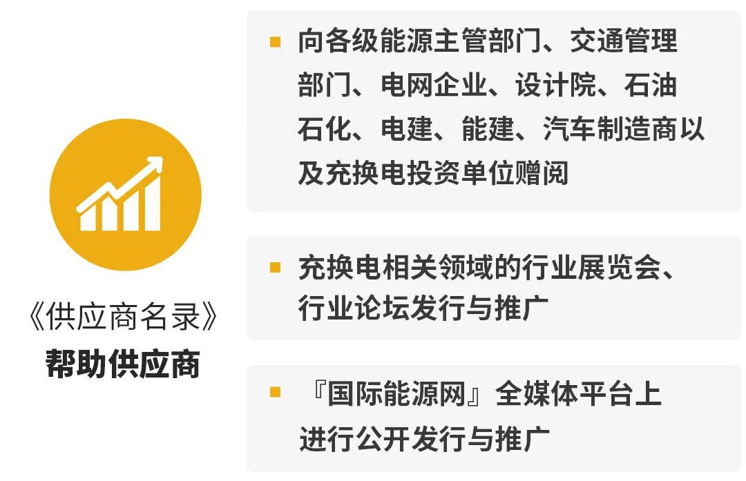 本次征集活动于5月5日正式开始,『国际能源网』及旗下《国际充换电网》将对各报名单位报送的资料进行遴选、评审后选入《供应商名录》。通过对供应商的筛选,将符合行业发展趋势的企业进行收录,构建供应商信息库,形成《供应商名录》,将有助于采购企业选择质优价廉的产品和服务,提升企业的采购效率。