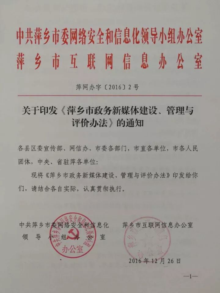 成立了市县(区)两级网信办,做到了机构编制人员经费“四到位”;率先制定出台了《萍乡市政务新媒体建设、管理与评价办法》、《萍乡市网评员积分考核激励办法(试行)》等规范性文件,确保网络管控有章可循、有据可依。