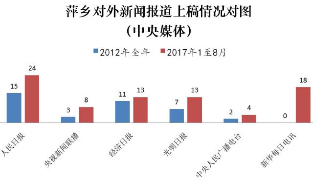 2012年全年,在中央媒体共计上稿38篇(条)。2017年1至8月,在中央媒体共计上稿80篇(条)。