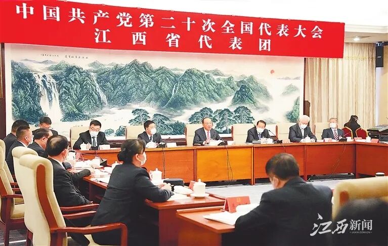 ▲10月17日上午,党的二十大江西省代表团在住地举行全体会议,认真学习、深刻领会党的二十大精神。