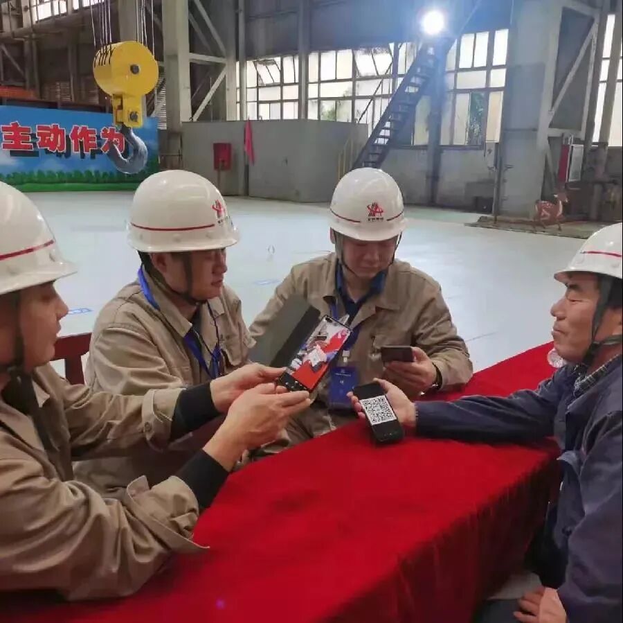 ▲安钢集团天车工技能大赛组委会裁判员们利用工作餐的间隙,积极参与普法竞赛答题活动的报名