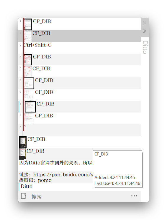 Ditto最核心的功能在于:将原本只能保存一次记录的剪贴板,扩展到了数百条甚至上千条记录,并且,提供了诸多非常实用的功能。