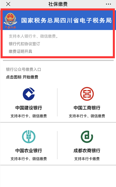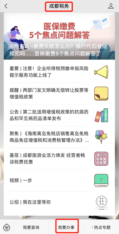 搜索并关注“成都税务”微信公众号,点击“我要办事—社保缴费—国家税务总局四川省电子税务局”。
