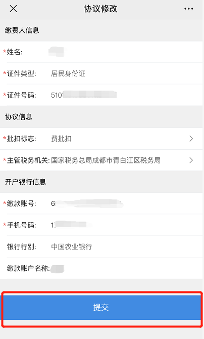 选择参保所在地税务机关,填写缴款账号、手机号码,点击“提交”。注意:“手机号码”必须与在开户银行预留的手机号码一致,否则会导致协议签订失败。新签的协议默认为批扣协议,如不参加批扣,请点击“修改”将“批扣标志”选为“费非批扣”或直接作废协议。