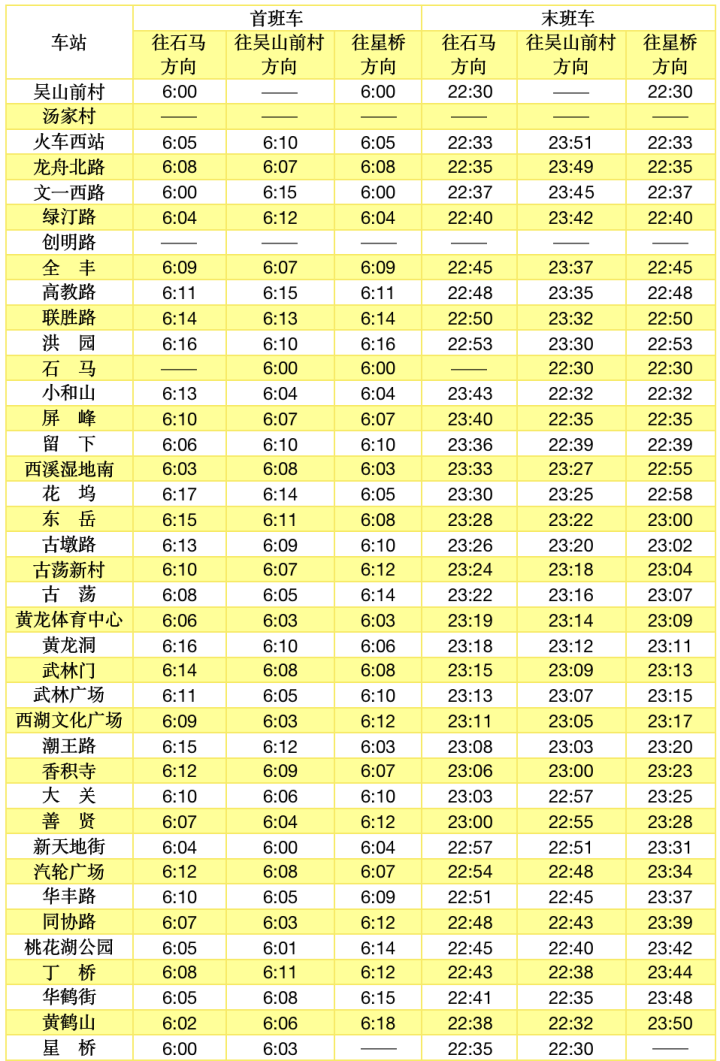 3号线北延段开通后,3号线运营时间为6:00-22:35。从吴山前村站至星桥站,全程大约需要86分钟。