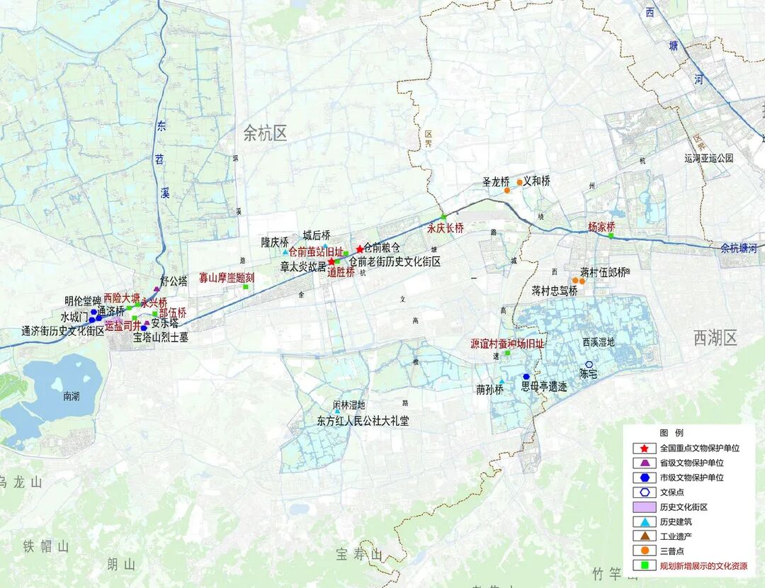 余杭区的运河沿线已保护的历史文化资源约68处,类型涵盖各历史时段文化价值较高的古桥、古塔、古墓、历史水工、历史文化街区等。本次规划建议新增展示的文化资源包括历史民俗、古遗址、新时代文化资源等,如西险大塘、奉口庙、永兴桥、仓前茧站旧址等。