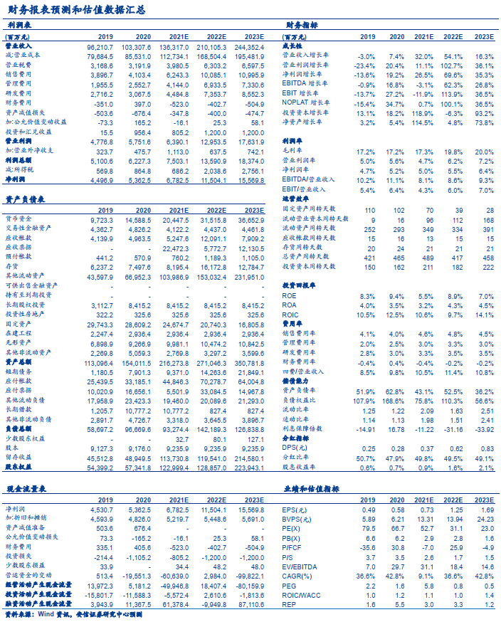 维持“买入-A”评级,6个月目标价45.5元/股。我们预计公司2021-2023年归母净利润分别至67.8、115.0、155.7亿元,对应当前市值,PE分别为52.7、31.1、23.0倍,6个月目标价45.5元/股,对应2022年36.5倍PE,维持“买入-A”评级。