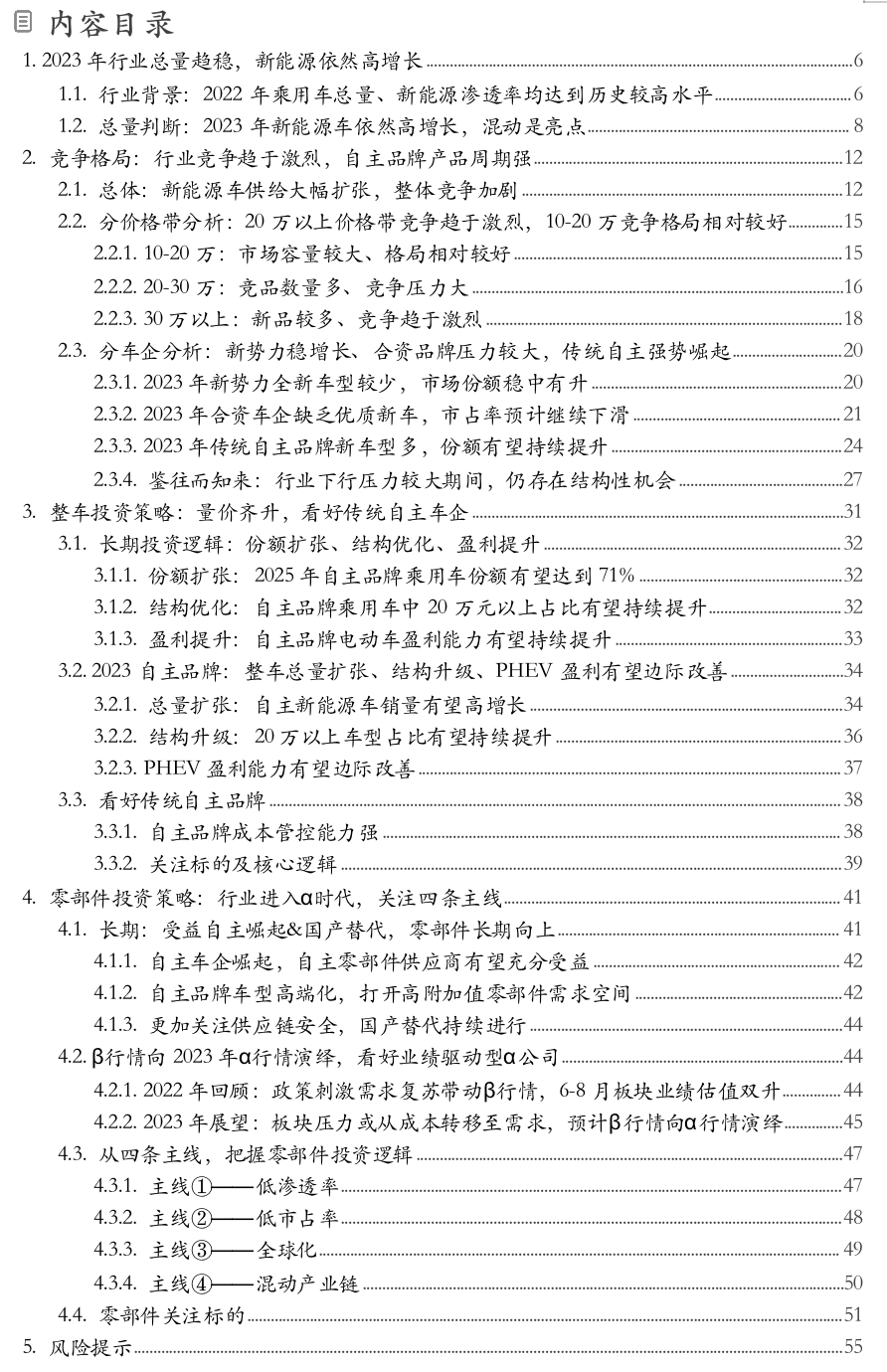 我们认为,整车股是非常优质的资产,其原因在于,长期看:自主份额有望持续扩张,结构有望持续优化,纯电平台技术有望不断创新迭代、带来电动车盈利持续提升。展望2023年:1)自主新能源车销量有望高增长;2)20万以上车型占比提升;3)PHEV盈利能力有望边际改善。对于2023年的整车行业投资,我们认为,考虑行业竞争日趋激烈,逐步进入拼成本时代,具有成本优势的传统自主车企有望迎来更大的投资机会。整车关注标的:比亚迪(三电技术领先、盈利有望持续超预期),长城汽车(新能源战略转型、将迎产品大年),吉利汽车(浩瀚架构下纯电+雷神混动放量),长安汽车(深蓝车型竞争力强有望放量+混动全面发力),广汽集团(纯电新品周期+混动从0到1)。