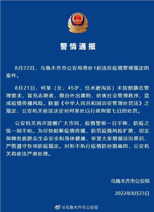 原标题:警情通报|乌鲁木齐市公安局查处1起违反疫情管理规定案件